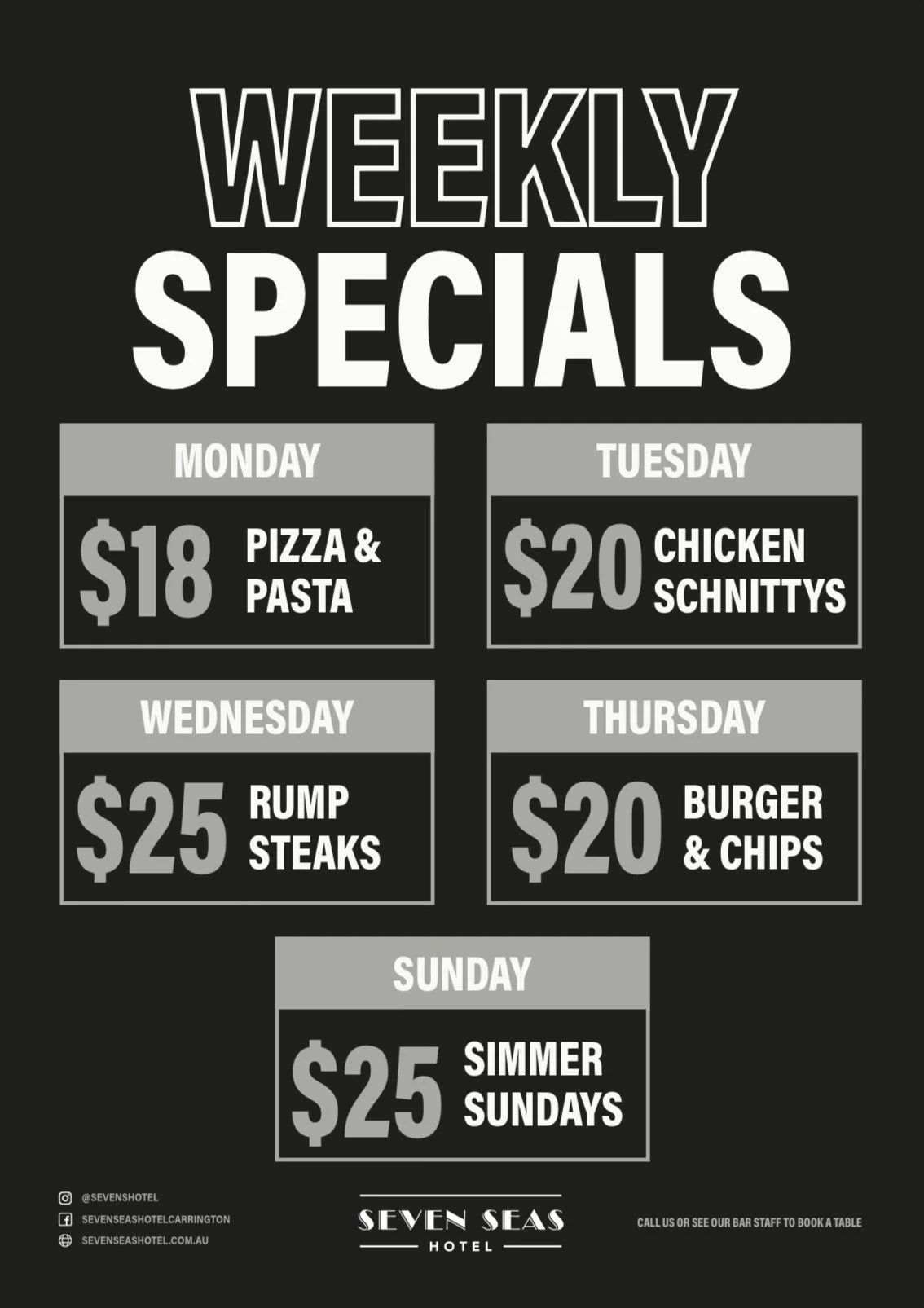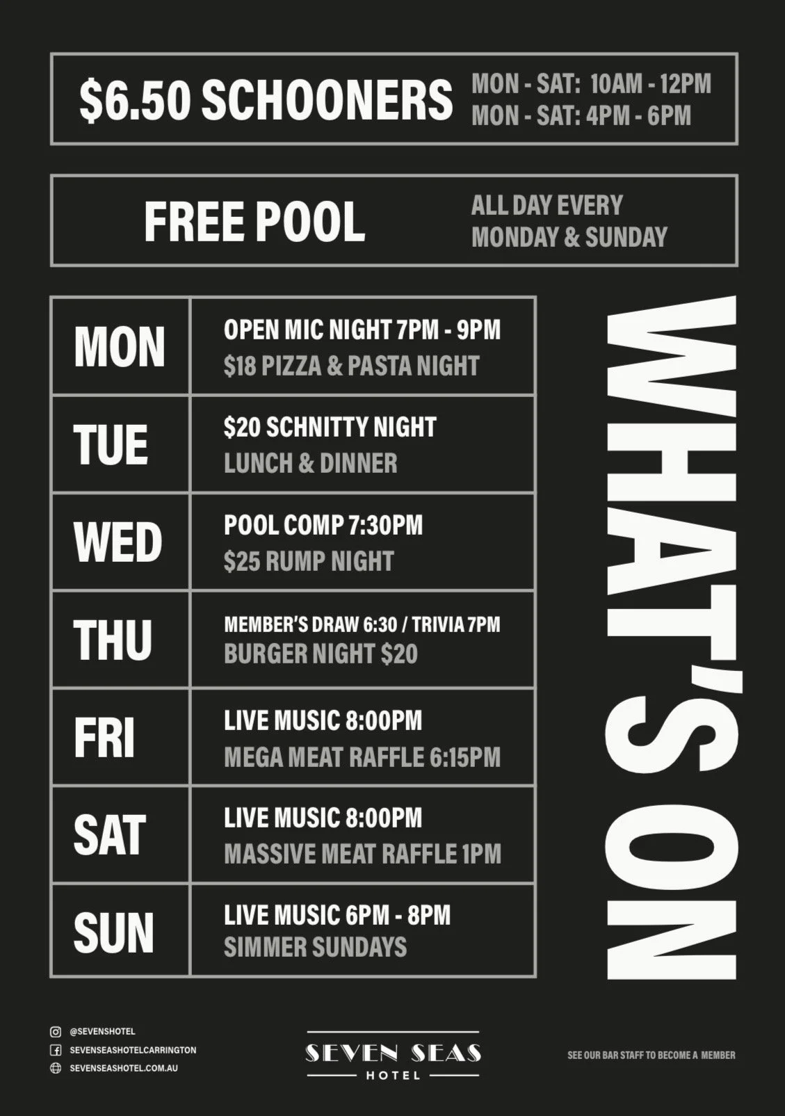 Not one but two Happy Hours, a punter’s club, food specials, open mic nights and much more.